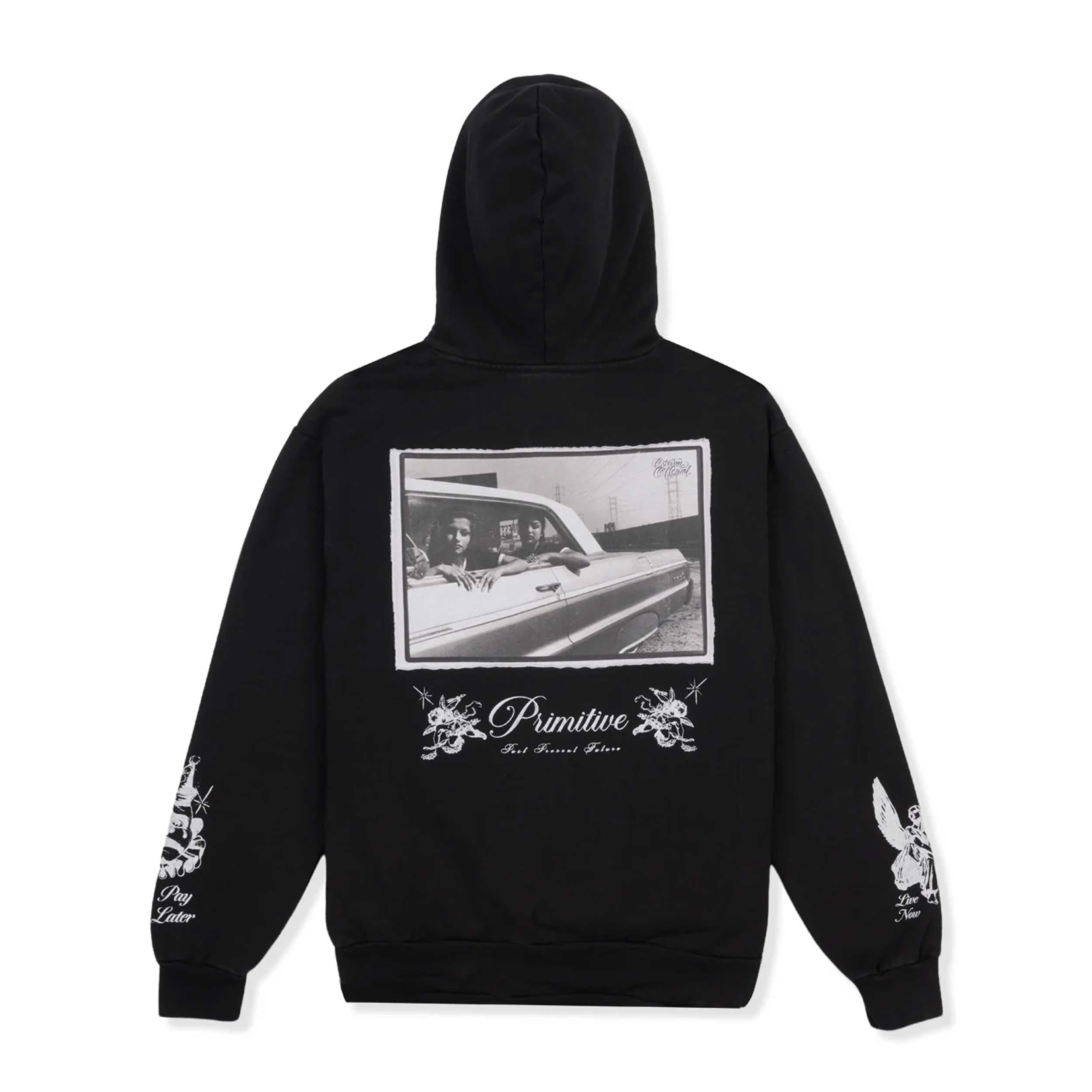 The Primitive x Estevan Oriol Vida Hooded Sweatshirt in Black is crafted from 100% premium cotton with a heavyweight 400gsm build, offering a durable, elevated feel that holds its shape. Designed in collaboration with legendary Los Angeles photographer Estevan Oriol, this hoodie blends streetwear style with authentic West Coast culture.